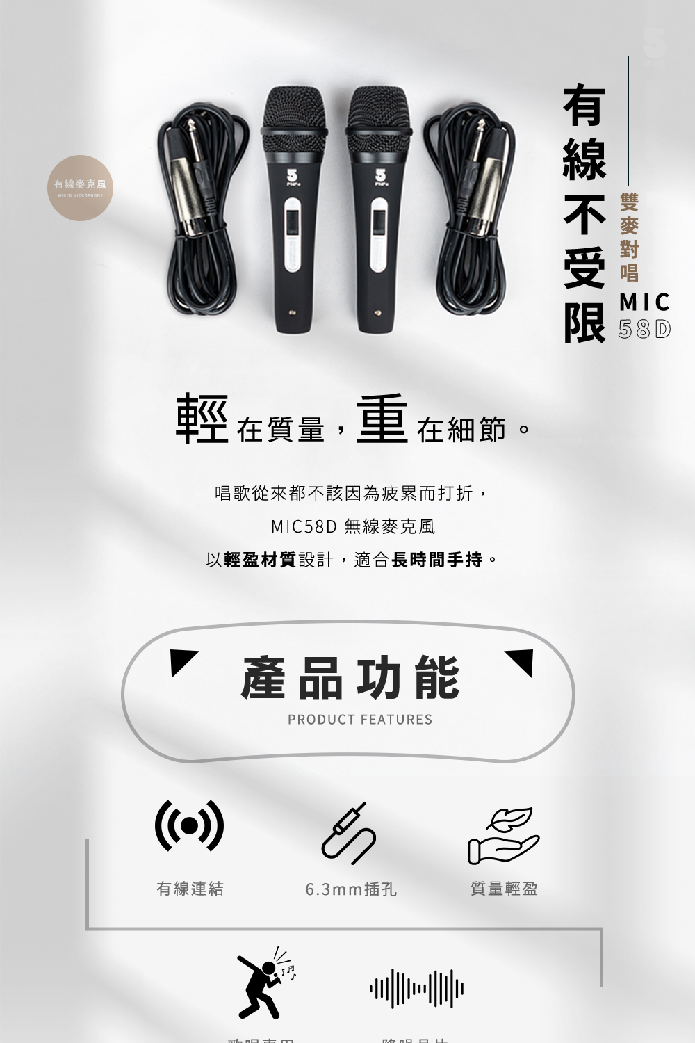 | 產品規格 | 產品型號:MIC58D 收音類型 :動圈式 指向性:心型指向性 靈敏度:-52dB±3dB 線長:約3m 響應頻率:40Hz-16KHz 輸出阻抗:600Ω±30% 尺寸:45x180mm 重量:212g(不含線) 產地:中國 |