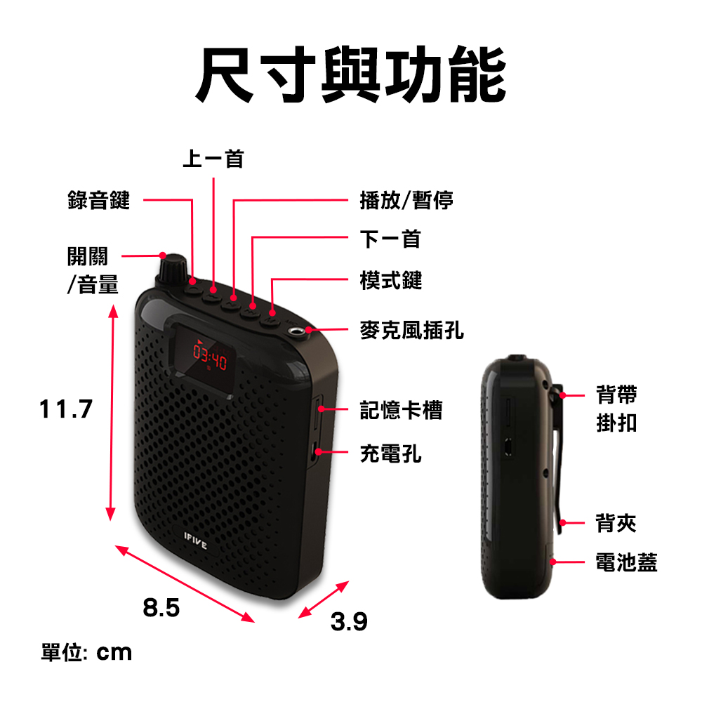 | 產品規格 | 輸出功率:5W 響應頻率:100-13K HZ 工作電壓:DC 3.7V 充電電壓:DC 5.0V 失真率:<1% 信噪比:80dB 電池容量:2000mAh 電池型號:18650 充電時間:3-5小時 分貝:可達120 使用擴音時間:>24小時(視音量大小) 產品尺寸:11.7 x 8.5 x 3.9 cm 其他功能:支援TF(microSD)卡、FM廣播、錄音模式 重量:110g(不含電池) 154g(含電池) 產地:中國 |